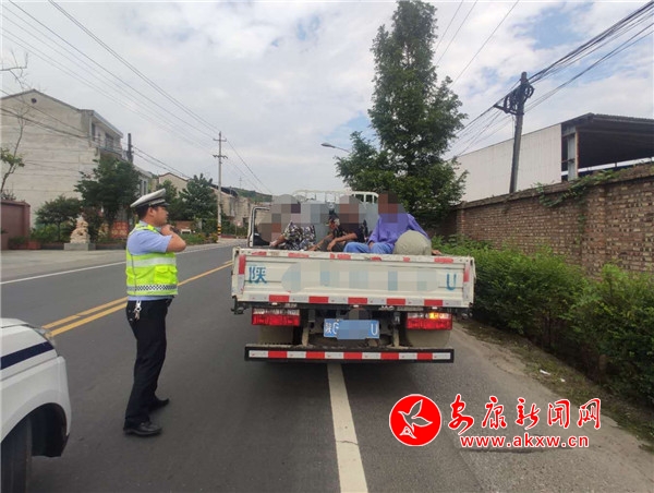 7月31日15時(shí)許,大隊(duì)執(zhí)勤民警在316國(guó)道沿線開展路面巡邏,行至恒口東大門時(shí),發(fā)現(xiàn)一輛號(hào)牌為皖A(yù)C***C號(hào)輕型欄板貨車后車廂有違規(guī)載人嫌疑,巡邏民警立即上前攔停,示意駕駛?cè)死钅衬惩\嚱邮軝z查。經(jīng)查,該貨車核定載人數(shù)為5人,實(shí)際載9人,貨車車廂違法載客4人,屬于貨車違法載客的嚴(yán)重交通違法行為。