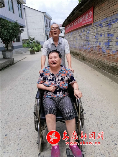 只要遇到好天氣,張業(yè)印就會用輪椅推著妻子到村部暢亮的大院巴上曬太陽,或一起到社區(qū)里鄰里之間串個門,一起聊家常;有時還會推著輪椅遠(yuǎn)到陜南民俗村第一村的魯家大院轉(zhuǎn)一轉(zhuǎn),讓妻子始終保持著愉悅的好心情。