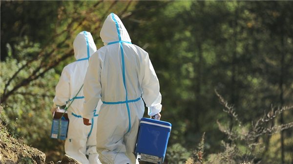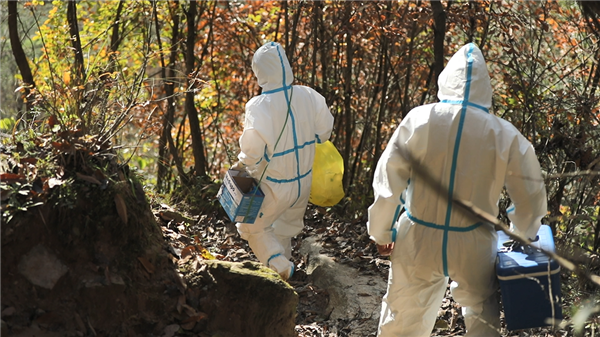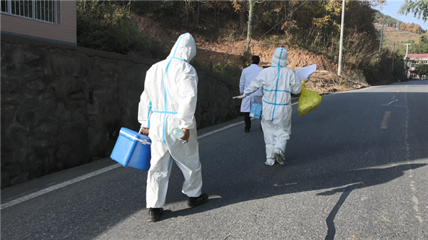 郭莉的腰間系著一個垃圾回收箱,王康提著防疫箱緊跟其后,捧著采樣管和未拆封的棉簽,一采一消,熟練地完成每一戶隔離群眾的核酸采樣。他們相互配合,收拾好消毒液等用品后,又駕車駛上蜿蜒的山道,馬不停蹄地趕往下一戶隔離群眾家中。