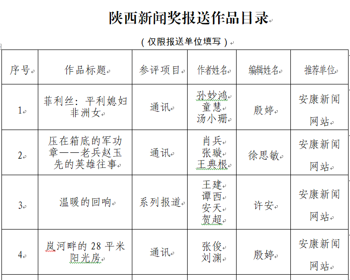 經過1月30日編委會推薦、社黨委研究決定,擬推薦以下4件新聞作品參評2023年度“陜西新聞獎”。公示時間從2024年3月6日至2024年3月12日,公示期為5個工作日。如有不同意見,請向安康日報社機關紀委、新聞管理部反映。