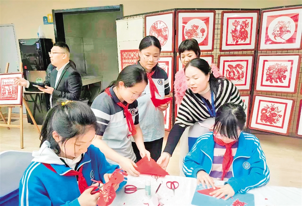 走進張莉的課堂里,滿目色彩繽紛的剪紙作品,大大小小地陳列在展臺處。整整齊齊的桌凳圍成一個個不同形狀,以便于學(xué)生更好地進行交流。她用學(xué)生通俗易懂的語言為學(xué)生傳授剪紙技巧:“同學(xué)們,我們首先把需要用的彩紙對折接著裁剪出合適的大小。然后再描出自己想要剪出的形狀……”通過紙張在指尖來回翻轉(zhuǎn),手中的剪刀“咔嚓咔嚓”,一幅幅美輪美奐的作品便呈現(xiàn)在眼前。每周張莉都要給學(xué)生們上幾節(jié)美術(shù)課,這也讓很多學(xué)生對剪紙產(chǎn)生了濃厚的興趣,創(chuàng)造出很多優(yōu)秀作品。