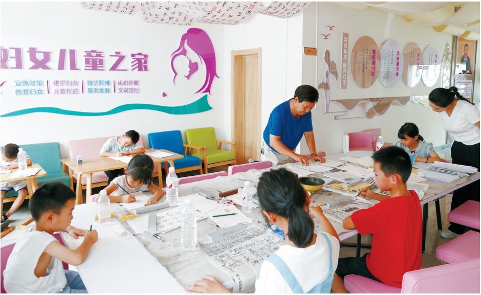 8月12日,塘坊壩社區(qū)聯(lián)合子中心,兒童在練習(xí)書法。