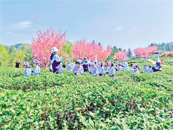 飯后陽光漫過茶壟的剎那,茶園正鋪展著千年的風雅。我迫不及待換上采茶圍裙踏入皇茶園,體驗采茶、做茶的樂趣。指尖輕捻“一芽一葉”的嫩綠,在古法炭焙的鐵鍋里翻涌著時光的溫度,待山泉水與雀舌相遇時,茶香便化作裊裊云煙,在青瓷盞中演繹生命的涅槃。