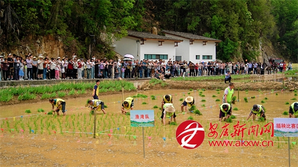 10點50分,插秧比賽正式開始,只見寨溝村、龍泉村、漁灣村、湯坪村四支隊伍在水田中依次排開。 隨著清脆的哨響,四支插秧隊伍迅速進入狀態(tài),水田瞬間化作激烈的賽場。彎腰俯身,左手攥緊秧苗,右手分秧、插秧,一株株嫩綠的秧苗被精準(zhǔn)插入田中,泥水飛濺間,選手們你追我趕,汗水與歡笑交織,將傳統(tǒng)農(nóng)事活動演繹成了一場精彩絕倫的視覺盛宴。