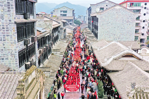 一縷微風穿過,黃昏的老街各種顏色交織碰撞,給人無限遐想。街道兩旁,店鋪一家挨著一家,幾家店外排著長隊,生意火爆。漢服、旗袍走秀、火獅子、舞龍、漢調(diào)二黃、花鼓戲入眼入耳。恍惚間,昔日的場景猶如一幅畫卷徐徐展開。