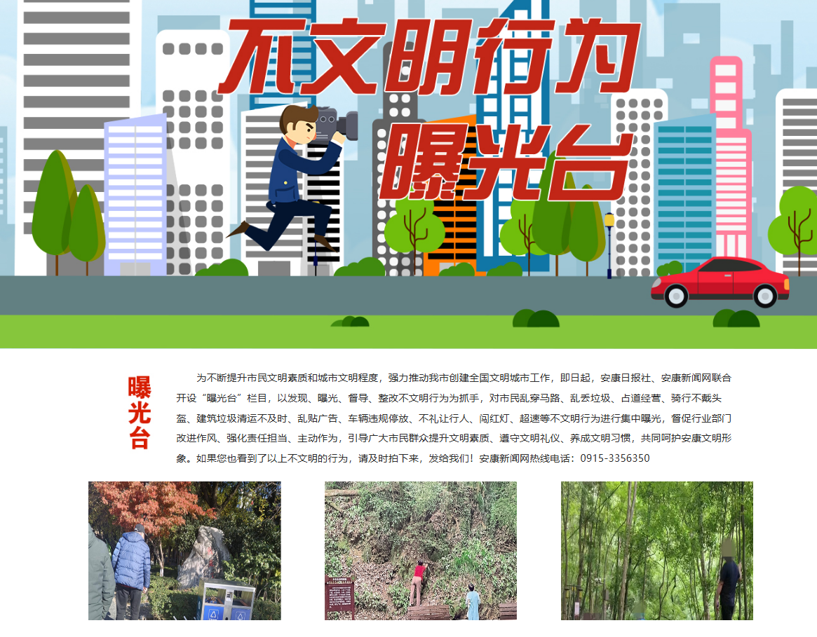 安康新聞網繼續(xù)充分發(fā)揮輿情監(jiān)測和輿論監(jiān)督作用,以高度負責的態(tài)度,及時監(jiān)測上報重大輿情信息。開設《不文明行為曝光臺》輿論監(jiān)督專欄,集中曝光身邊的不文明現象、行為,發(fā)布消息報道19篇,引導市民群眾自覺規(guī)范文明行為,主動融入城市文明創(chuàng)建熱潮,為提升市民文明素質和城市文明程度貢獻媒體力量,體現地方黨媒的責任與擔當。