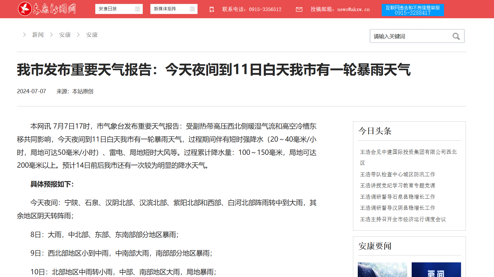 《我市發(fā)布重要天氣報告:今天夜間到11日白天我市有一輪暴雨天氣》(2024-07-07發(fā)布)