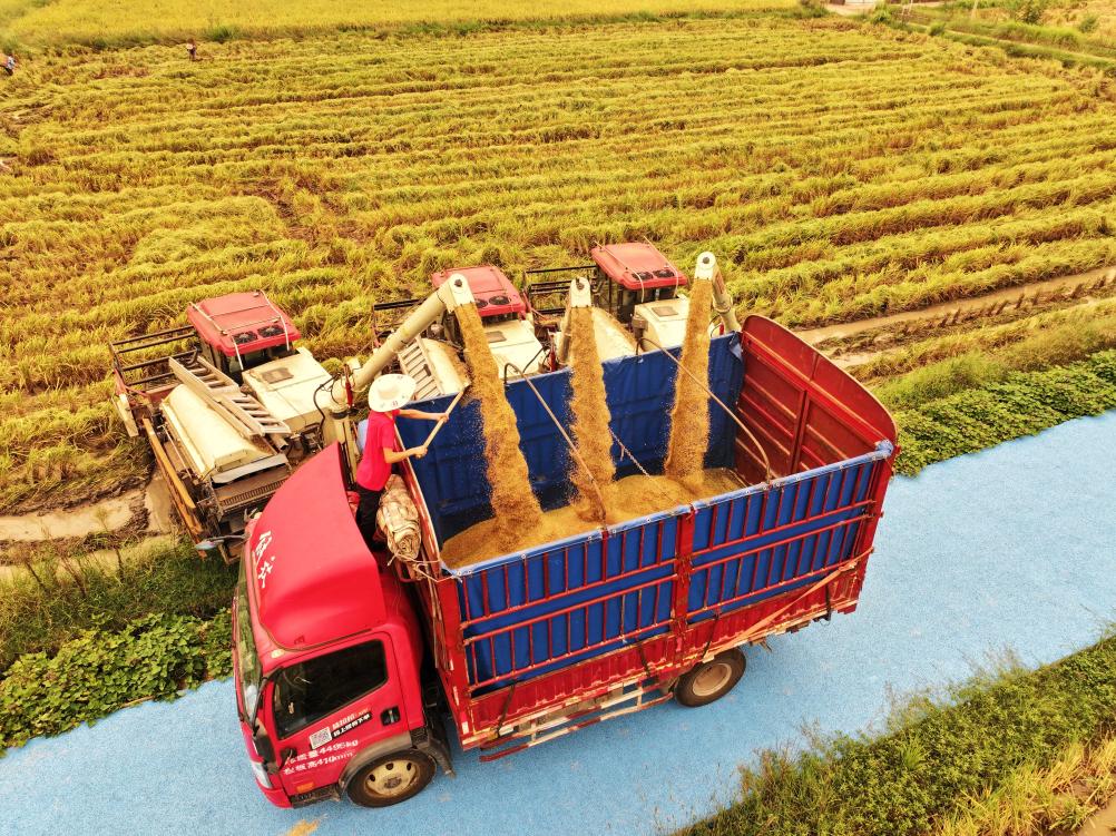 近日,四川省達(dá)州市渠縣有慶鎮(zhèn)太陽村農(nóng)民轉(zhuǎn)運(yùn)剛收獲的水稻(無人機(jī)照片)。白露節(jié)氣之際,各地農(nóng)民搶抓農(nóng)時(shí),田間地頭一片農(nóng)忙景象。新華社發(fā)(鄧良奎 攝)