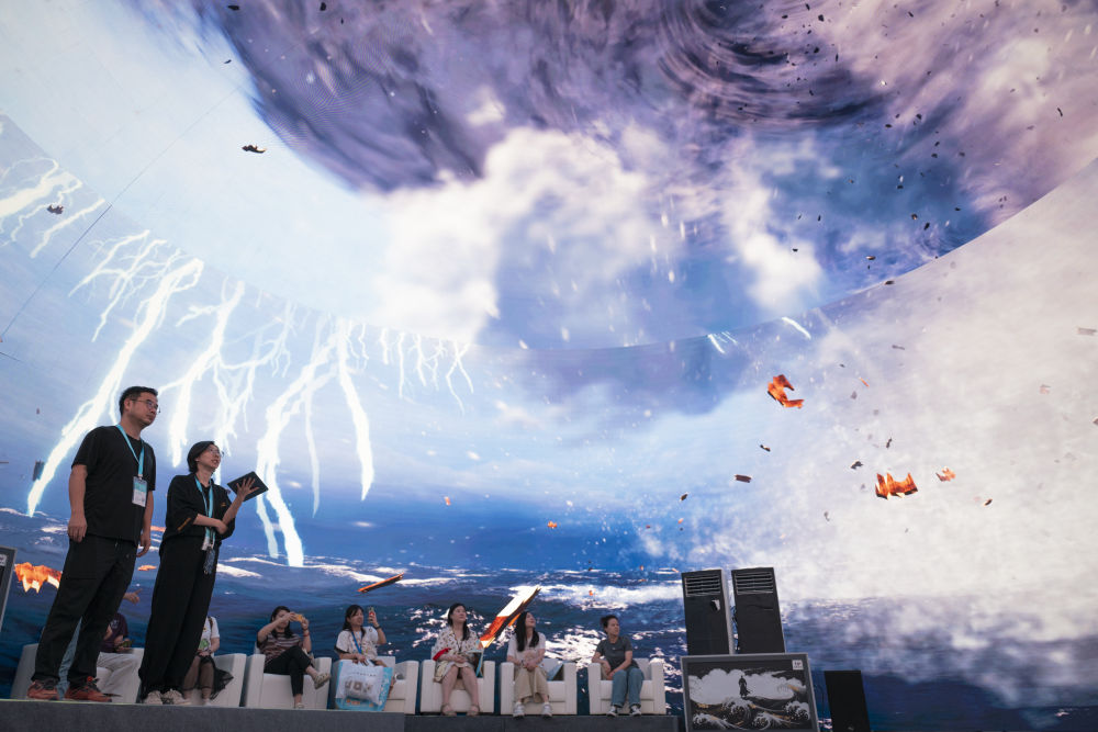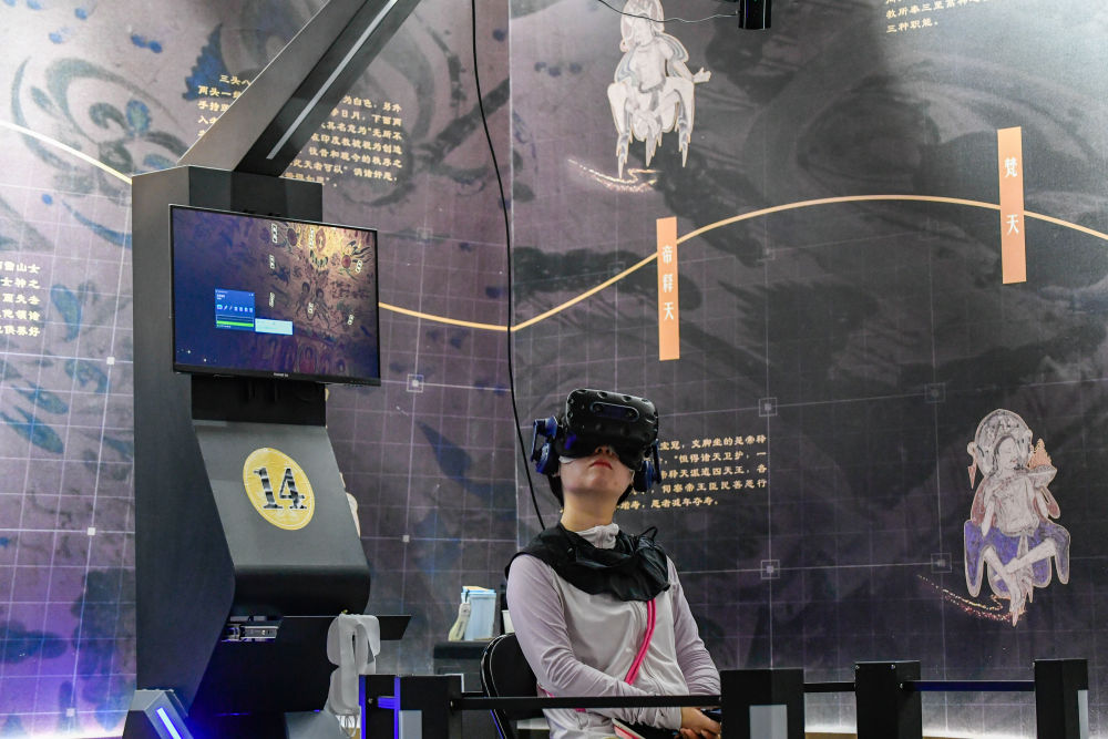 2024年7月22日,游客在“尋境敦煌——數(shù)字敦煌沉浸展”借助VR設(shè)備沉浸式游覽莫高窟第285窟虛擬場(chǎng)景?!皩ぞ扯鼗汀獢?shù)字敦煌沉浸展”綜合運(yùn)用VR虛擬現(xiàn)實(shí)、三維建模、游戲引擎的物理渲染和全局動(dòng)態(tài)光照等新技術(shù),高精度立體還原了莫高窟第285窟。游客戴上VR眼鏡,不僅可以零距離觀賞壁畫(huà)、360度自由探索洞窟細(xì)節(jié),還能“飛升”到窟頂,身臨其境參與壁畫(huà)故事情節(jié),沉浸式感受敦煌文化的魅力。