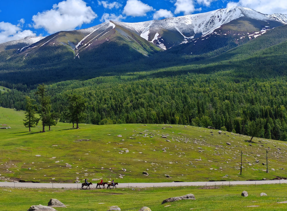 2024年6月4日,游客在新疆阿勒泰地區(qū)哈巴河縣騎馬游玩。電視劇《我的阿勒泰》播出后,新疆阿勒泰地區(qū)迎來(lái)客流高峰,“張鳳俠的小賣(mài)部”“巴太樹(shù)”“彩虹布拉克”等劇中地點(diǎn)成為熱門(mén)旅游打卡地。這場(chǎng)“邊城”與“熱劇”雙向奔赴的文旅盛宴,為當(dāng)?shù)亟?jīng)濟(jì)發(fā)展帶來(lái)新的增長(zhǎng)點(diǎn)。2024年5月,當(dāng)?shù)亟哟慰?15.03萬(wàn)人次,同比增長(zhǎng)60.81%;實(shí)現(xiàn)旅游收入36.53億元,同比增長(zhǎng)88.25%。