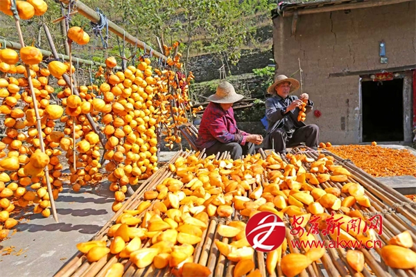 鄉(xiāng)親們趁著柿子還沒(méi)軟就采摘下來(lái),在房前屋后搭起一排排晾曬柿餅的木架,開(kāi)始每年一次的傳統(tǒng)手工勞作:去皮、懸掛、晾曬。出霜后就成了美味的柿餅。