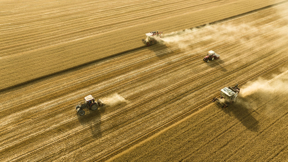 2025年6月4日,在河南省商丘市梁園區(qū)李莊鎮(zhèn)潘堂村志誠種植農(nóng)民專業(yè)合作社,農(nóng)機手操作機械在農(nóng)田作業(yè)(無人機照片)。新華社發(fā)(李恒 攝)