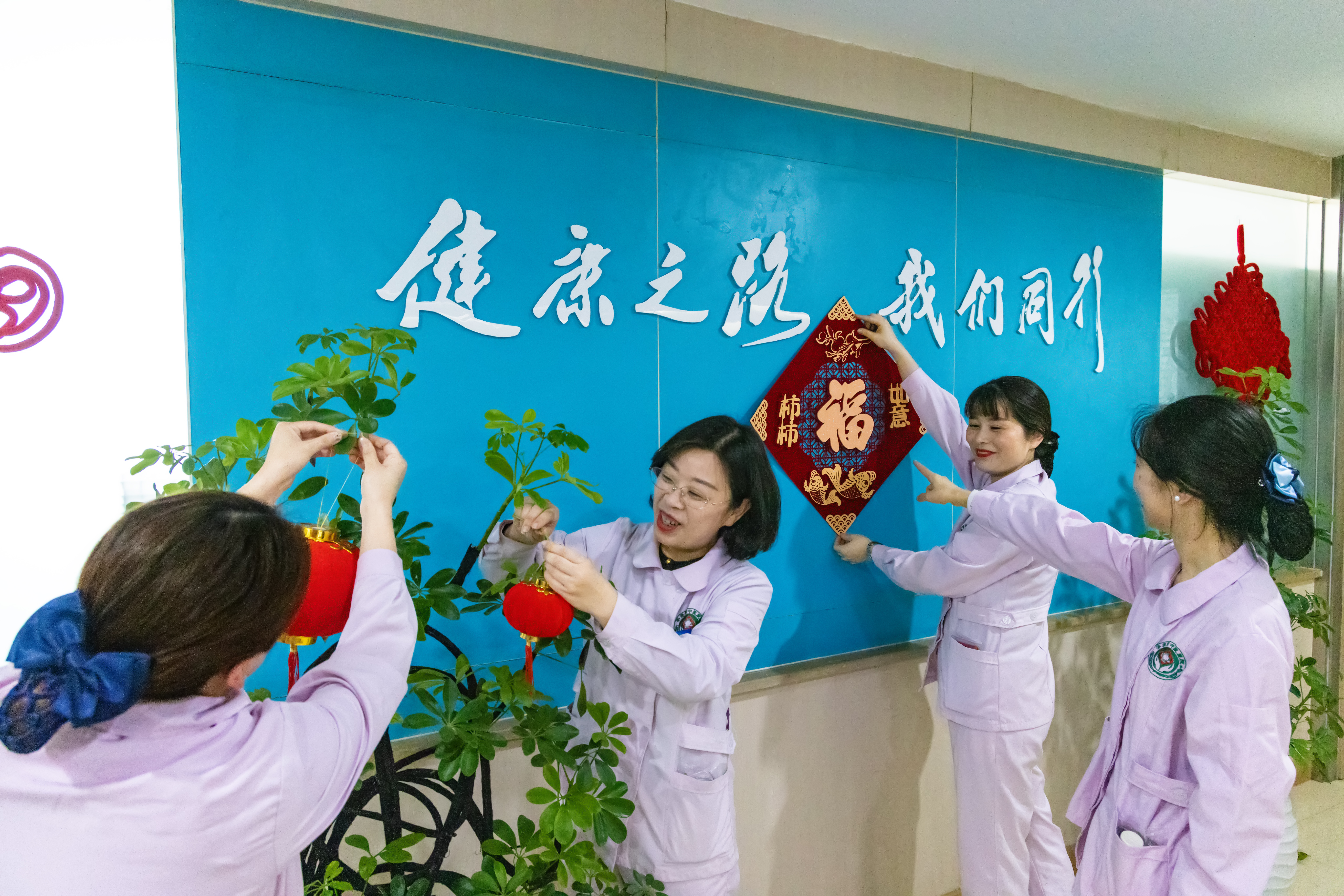 ⑦ 春節(jié)值守的安康市中醫(yī)醫(yī)院老年病工作人員將護(hù)士站裝飾一新,為醫(yī)患營(yíng)造溫馨的節(jié)日氛圍。郭圣杰 攝