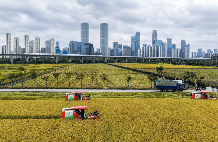 收割機在位于浙江杭州蕭山區(qū)世紀(jì)田園糧食功能區(qū)的稻田里收割水稻,遠處高鐵列車飛馳而過(2025年10月21日攝,無人機照片)。新華社記者 徐昱 攝