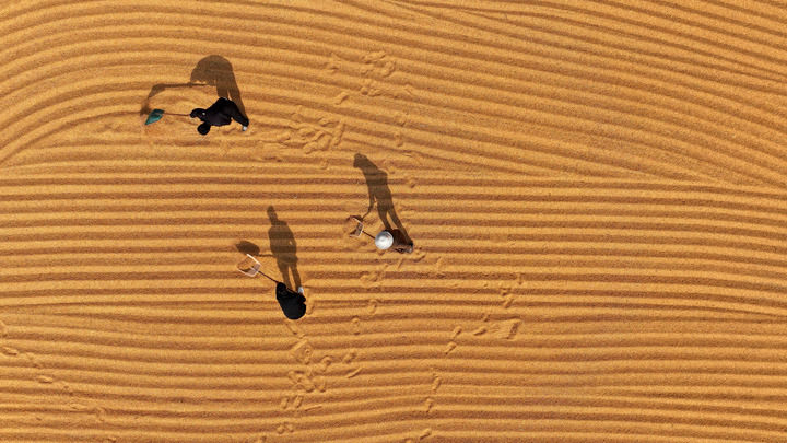 2025年10月28日,在山東省棗莊市市中區(qū)稅郭鎮(zhèn),農民晾曬收獲的玉米(無人機照片)。新華社發(fā)(孫中喆 攝)