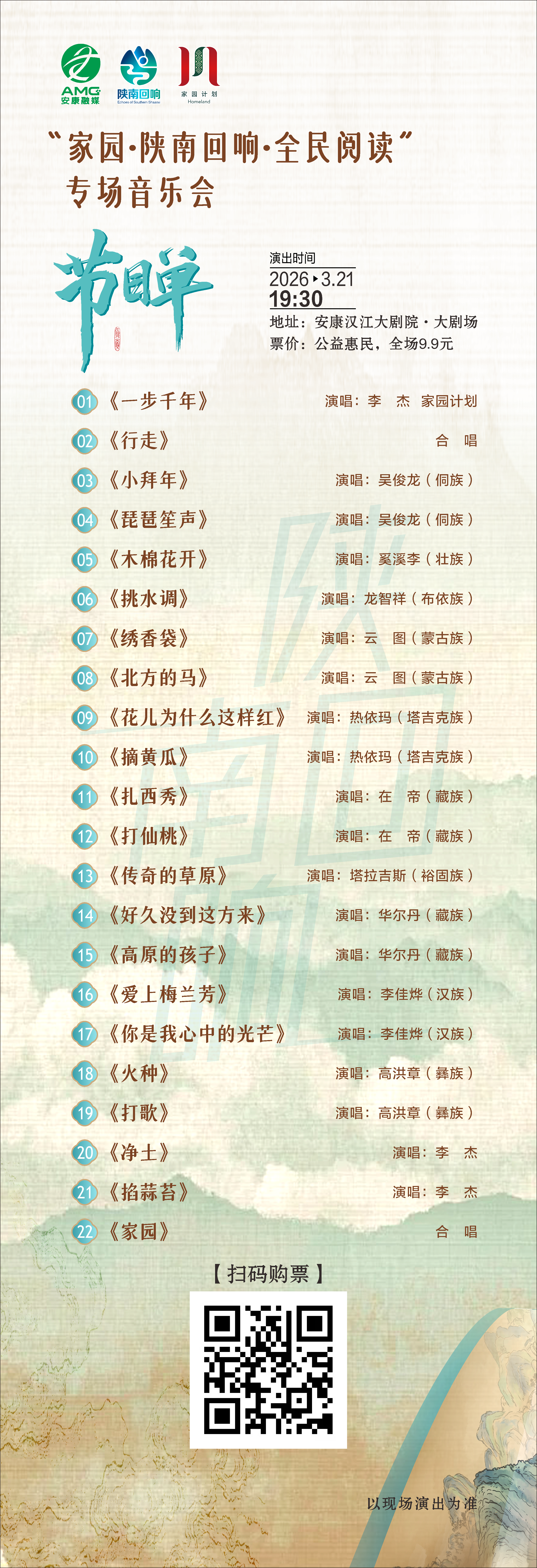 今年2月1日,《全民閱讀促進(jìn)條例》正式施行,標(biāo)志著全民閱讀邁入法治化、規(guī)范化的發(fā)展新階段。條例明確指出,要鼓勵(lì)開展內(nèi)容健康、展現(xiàn)文化底蘊(yùn)、形式多樣的閱讀推廣活動(dòng)。在安康,閱讀不僅是靜默的文字,更可以是躍動(dòng)的音符、流淌的旋律。3月21日(周六)19:30,一場(chǎng)別開生面的“家園·陜南回響·全民閱讀”專場(chǎng)音樂(lè)會(huì)將在安康漢江大劇院大劇場(chǎng)拉開帷幕。這場(chǎng)由著名音樂(lè)人李杰領(lǐng)銜、匯聚九大民族藝術(shù)家的視聽盛宴,邀您共赴一場(chǎng)“用歌聲閱讀大地”的詩(shī)意之約。