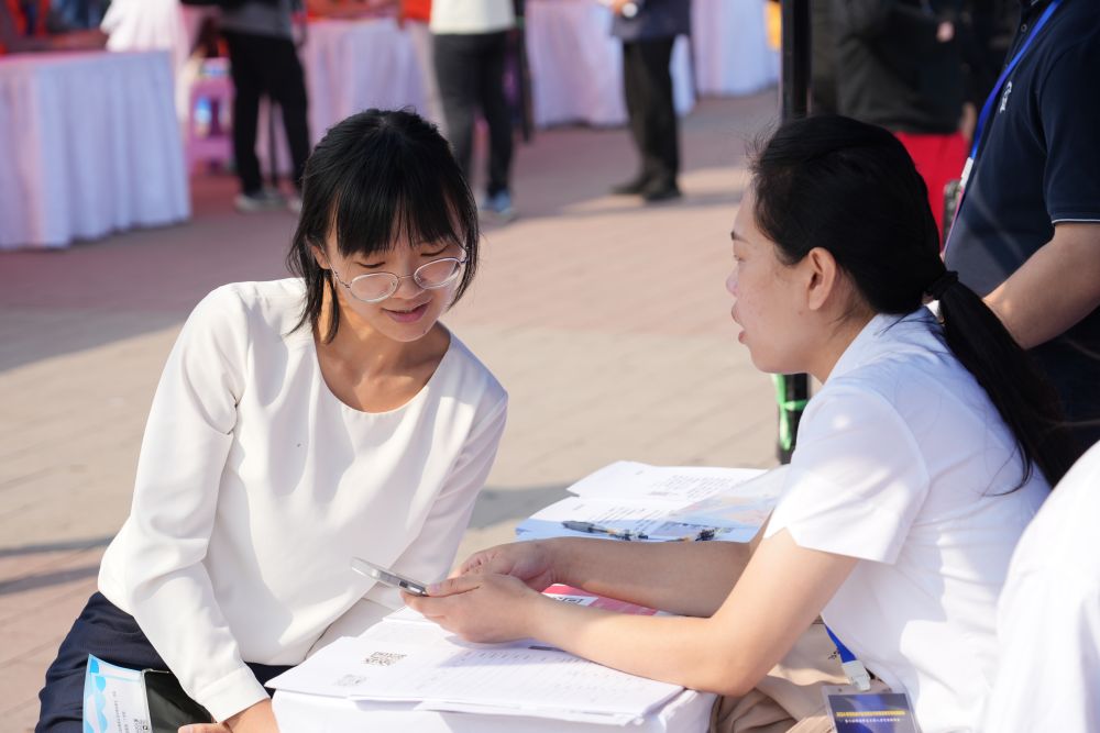 2024年9月25日,求職者(左)在招聘會現(xiàn)場與招聘單位工作人員交流。當日,雄安新區(qū)舉辦2024年河北省畢業(yè)生就業(yè)市場雄安新區(qū)專場招聘會暨河北雄安新區(qū)大型人力資源招聘會。招聘會以“穩(wěn)崗就業(yè) 聚才發(fā)展”為主題,邀請京津冀地區(qū)共157家企業(yè)線下參會,提供就業(yè)崗位4783個。