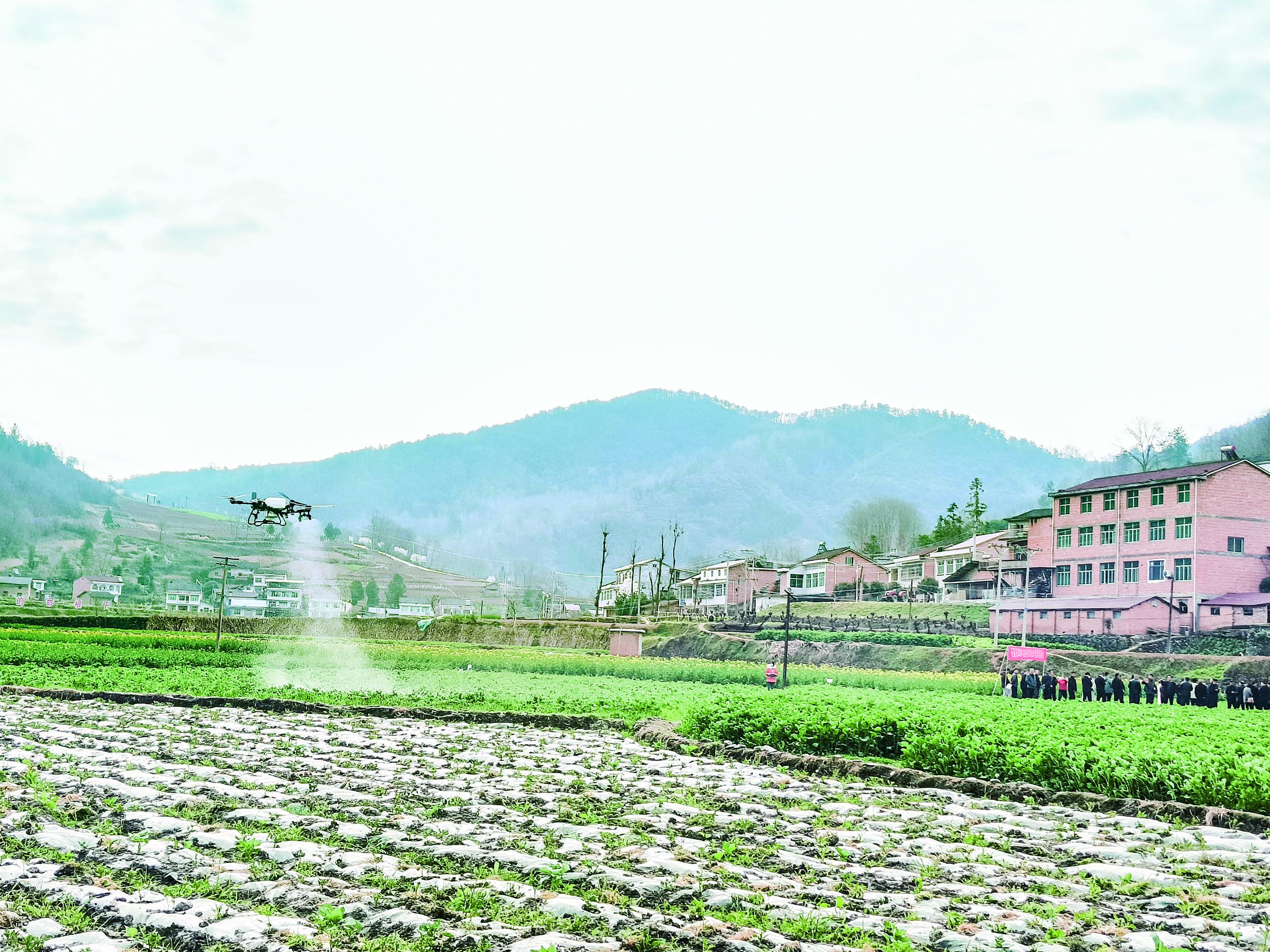 3月12日,石泉縣中池鎮(zhèn)開展第三十四屆“科技之春”宣傳月系列活動。圖為植保無人機(jī)飛防作業(yè)演示。