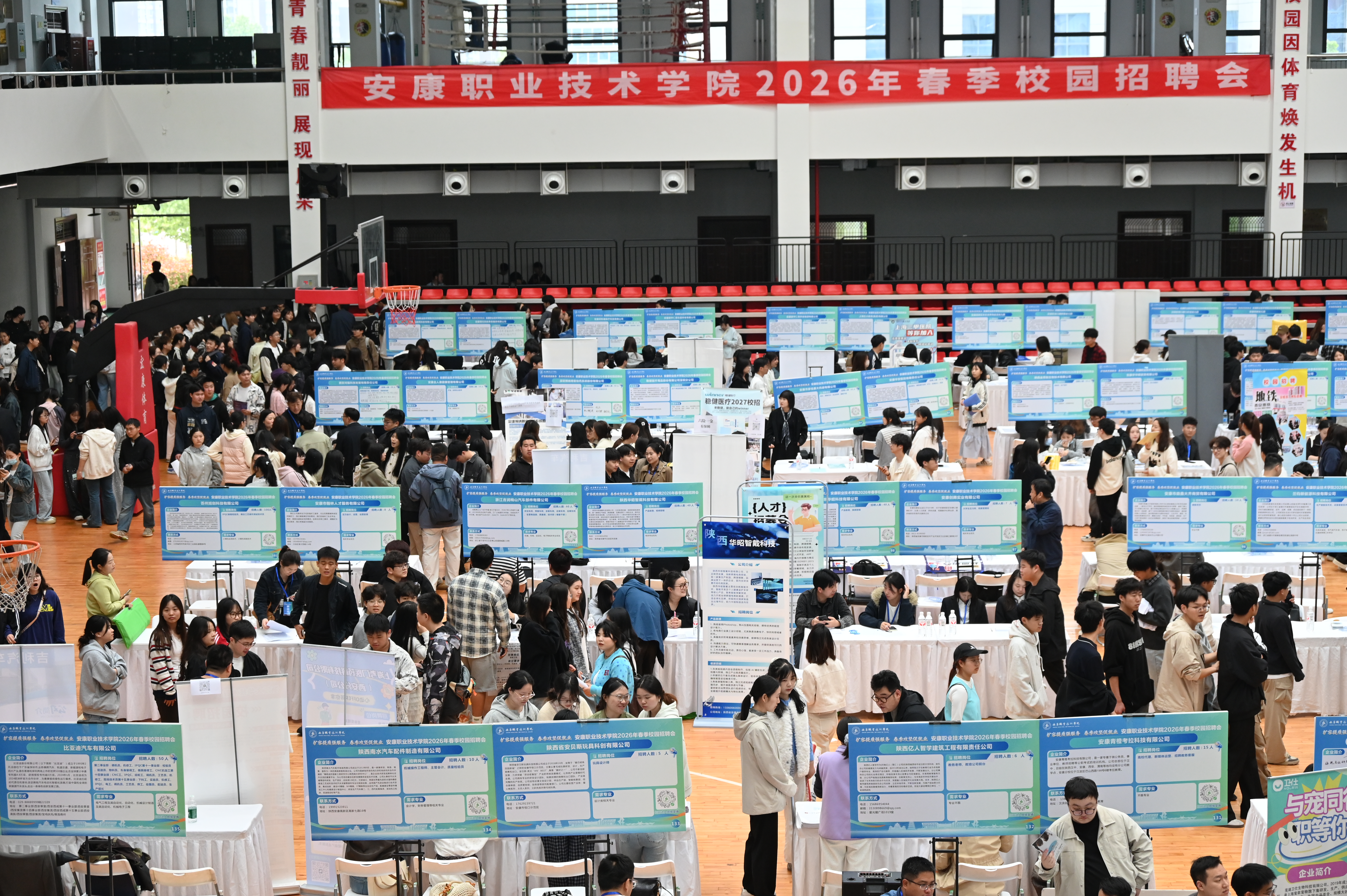 4月10日,由安康市人社局與安康職業(yè)技術(shù)學(xué)院聯(lián)合舉辦的“2026年春季校園招聘會(huì)”,在學(xué)院體育館落幕。本次招聘會(huì)吸引170家企業(yè)參會(huì),提供崗位6023個(gè),到場學(xué)生4000余人。