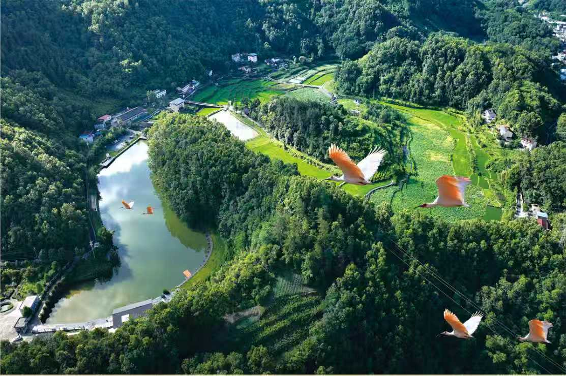 田野間,國家一級保護(hù)動物朱鹮悠然棲息——或低頭覓食,或振翅掠過水面,與村莊、稻田構(gòu)成一幅和諧共生的畫面。